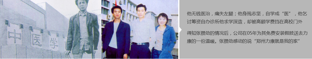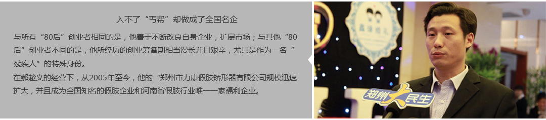 鄭州市力康假肢矯形器有限公司(簡(jiǎn)稱力康),是一家專業(yè)從事假肢矯形器的設(shè)計(jì)、研發(fā)、制作及裝 配的專業(yè)機(jī)構(gòu)。成立于1992年是河南省唯一一家福利企業(yè)。力康下設(shè)業(yè)務(wù)部、技術(shù)部、住院部、康復(fù) 部、售后服務(wù)部,并配有現(xiàn)代化的裝配車間和功能齊全的訓(xùn)練大廳,為殘疾朋友康復(fù)訓(xùn)練提供了可靠 保障??偨?jīng)理穿戴假肢多年,有著豐富的臨床經(jīng)驗(yàn)和親身體會(huì);多年來,力康已為全國(guó)幾十萬名殘疾 朋友安裝上舒適、美觀、耐用的假肢和矯形器具,使他們更大限度地恢復(fù)了正常的工作和生活?!爱a(chǎn) 品即人品”的質(zhì)量理念、先進(jìn)的技術(shù)、實(shí)惠的價(jià)格、完善的售后服務(wù)是力康取勝的法寶……